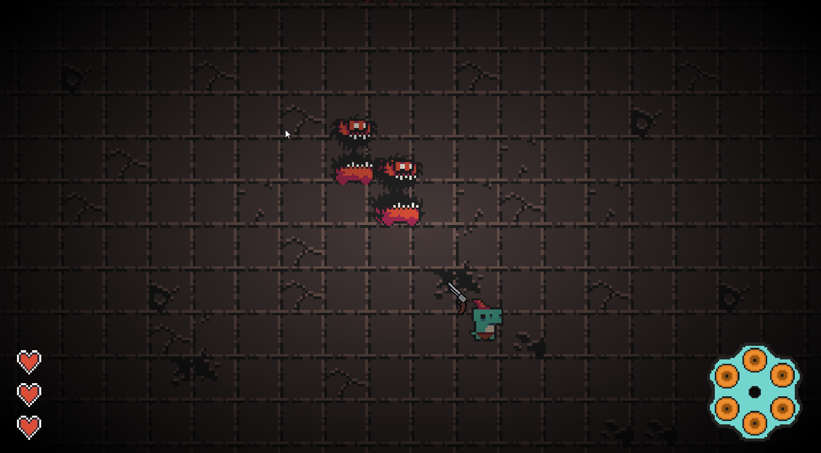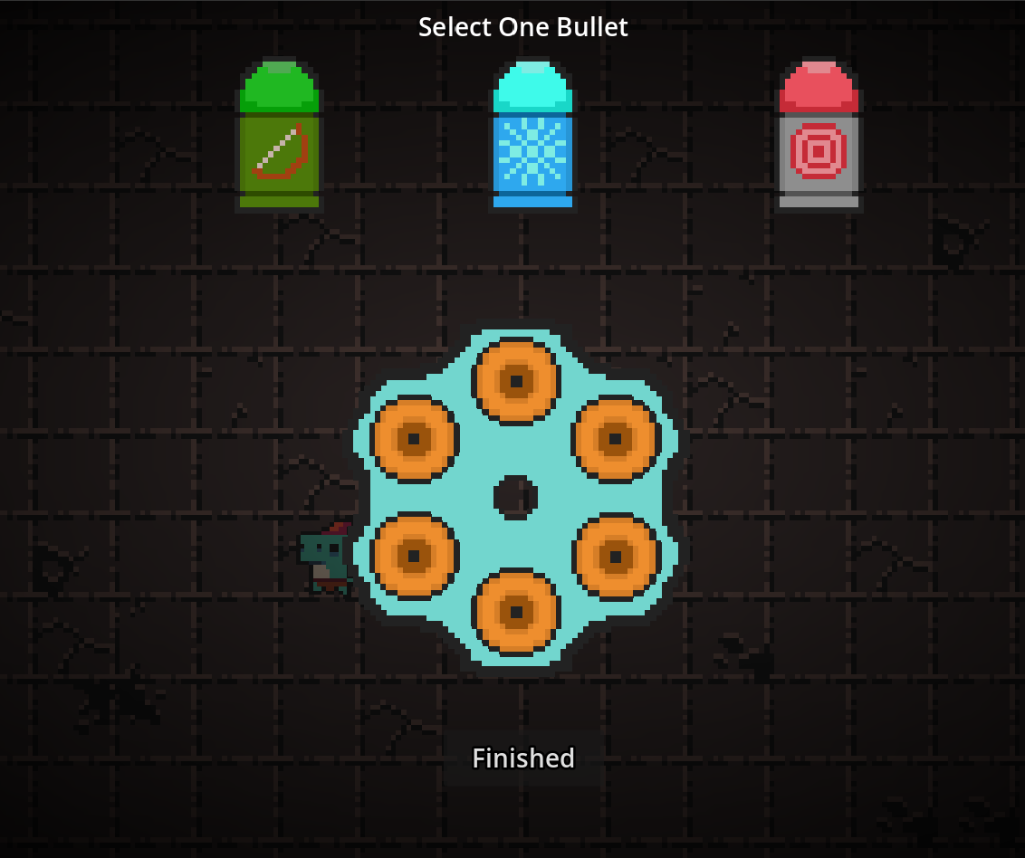 Chambered is a game in which you are a lil dino with a big gun. You only have 6 chambers in your barrel, so be careful to choose your bullets wisely. Some bullets have effects that can both help and hinder you.
